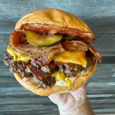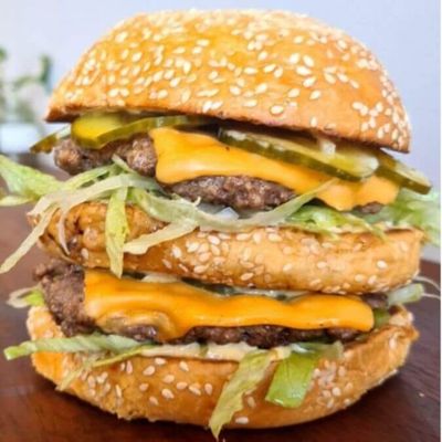 Double Beef, Double Bacon, Double Cheese, Mustard Mayo, Tomato Relish, Pickles