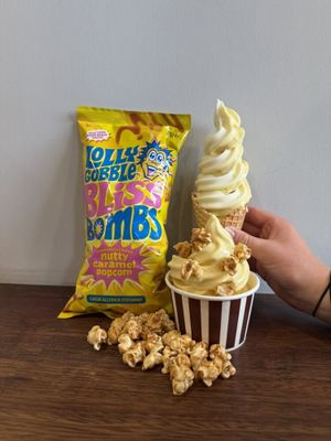 Delicious Popcorn Soft Serve served with Caramel Popcorn.