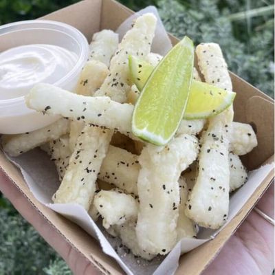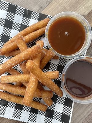 Fried Donut Fries, coated in sugar and served with Salted Caramel or Chocolate Fudge.