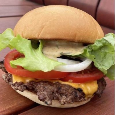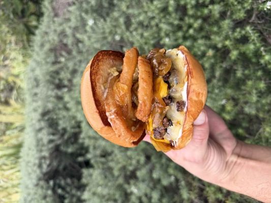 Double beef, American Cheese, Swiss Cheese, Onion Jam, Mayo, French Onion Dip, Onion Rings
