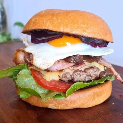 Hand Pressed Angus Beef - Bacon - Fried Egg - Beetroot - Onion Jam - Cheese - Lettuce - Tomato - BBQ Sauce