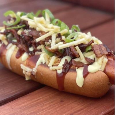 Smoked Pork Frankfurt - Ketchup - Cheese - Bacon - Mustard - Toasted Brioche Roll